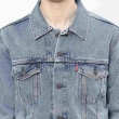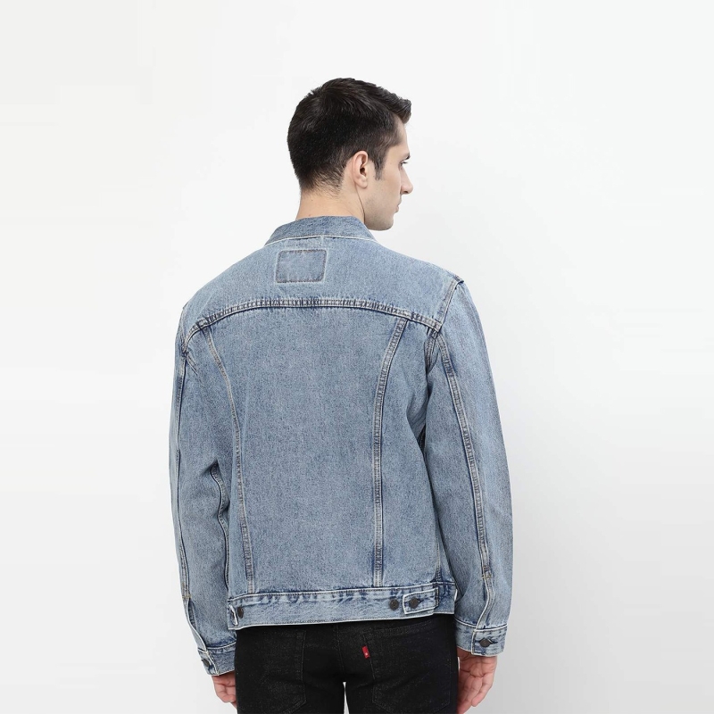 سترة سائق شاحنة من الدنيم بدون ماء مغسولة باللون الأزرق ، لها ياقة منتشرة ، 4 جيوب ، زر إغلاق ، أكمام طويلة ، حافة مستقيمة ، وبطانة قطنية.